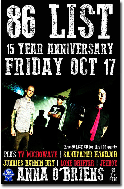 86 List is a three piece punk rock band based in Honolulu, Hawaii. They have been playing since 1999. They have released 5 albums independently and are know for their DIY ethic, hand manufacturing and designing all of their own merchandise. The music is more comparable to roots punk rock bands such as the Clash, Stiff Little Fingers and Bad Religion. They are know to be political in some of their music with a disdain for corporate America, racism, and homophobia.
