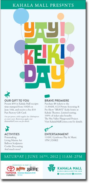 HONOLULU, HI, June 7, 2012 Kahala Mall has a full and fun day planned to celebrate Hawaii keiki this year. On Saturday, June 16th from 11:00 a.m. until 2:00 p.m., parents and children will enjoy non-stop entertainment throughout the day featuring an all-keiki rock band, EMKE, a variety of arts and crafts activities, and a Disney Pixar Brave movie keiki station.