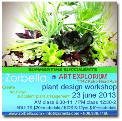 Make something creative this summer with our friends from Zorbella! Sign up today for their unique Succulent Plant Design Workshop at Art Explorium. Adults and children ages 5 & up are welcome to sign up. Each participant will create and take home a beautiful succulent plant arrangement. Adult fee is $20 + materials. Fee for kids ages 5-12 is $10 + materials. There will be two workshops held: one from 9:30-11:00 am and one from 12:30-2:00 pm. Call or email to register: 772-3732, info@zorbella.com.