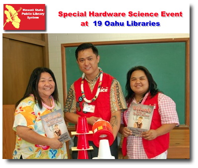 Dean Ramos (center), Wizard-in-Training of HouseMart Ace Hardware and HouseMart Ben Franklin Crafts, and (l-r) helpers Joy Shimabukuro and Kristane Gaspar invite Oahu keiki ages 8 and older to experience a special "Hardware Science" program at 19 selected Oahu public libraries.