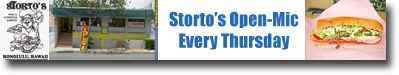 Every Thursday from 6-10pm is Open-Mic night at Storto's Deli Honolulu. 3184 Waialae Ave. Food and beverage specials all night. This is an all-ages event with no alcohol served and no cover charge. Parking always available up the ramp, behind the building and behind the Garlic restaurant. Call 739-2009 for more info! See you Thursday night.