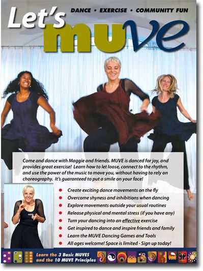 MUVE means music & movement and it all started because music is what moves Maggie. Growing up in a tiny farming community with no access to dance lessons, she forged a close bond with the radio and turned the living room into her dance space. She has been singing and dancing to the music ever since. She says, My body and voice are my instruments. How could I just listen when I could sing and dance along? Ill be forever grateful that nobody stopped me or laid down heavy rules. Maggies dancing is always spontaneous -- inspired in the present moment, and always an expression of the free and joyful spirit she is. Dancing is her passion and her art, and with the production of her dance/exercise video, she is realizing her most cherished dream. Maggies mission is to inspire everyone to feel the joy of moving their bodies to the rhythm of the music, getting the physical exercise the body needs, while freeing the mind and feeding the soul.