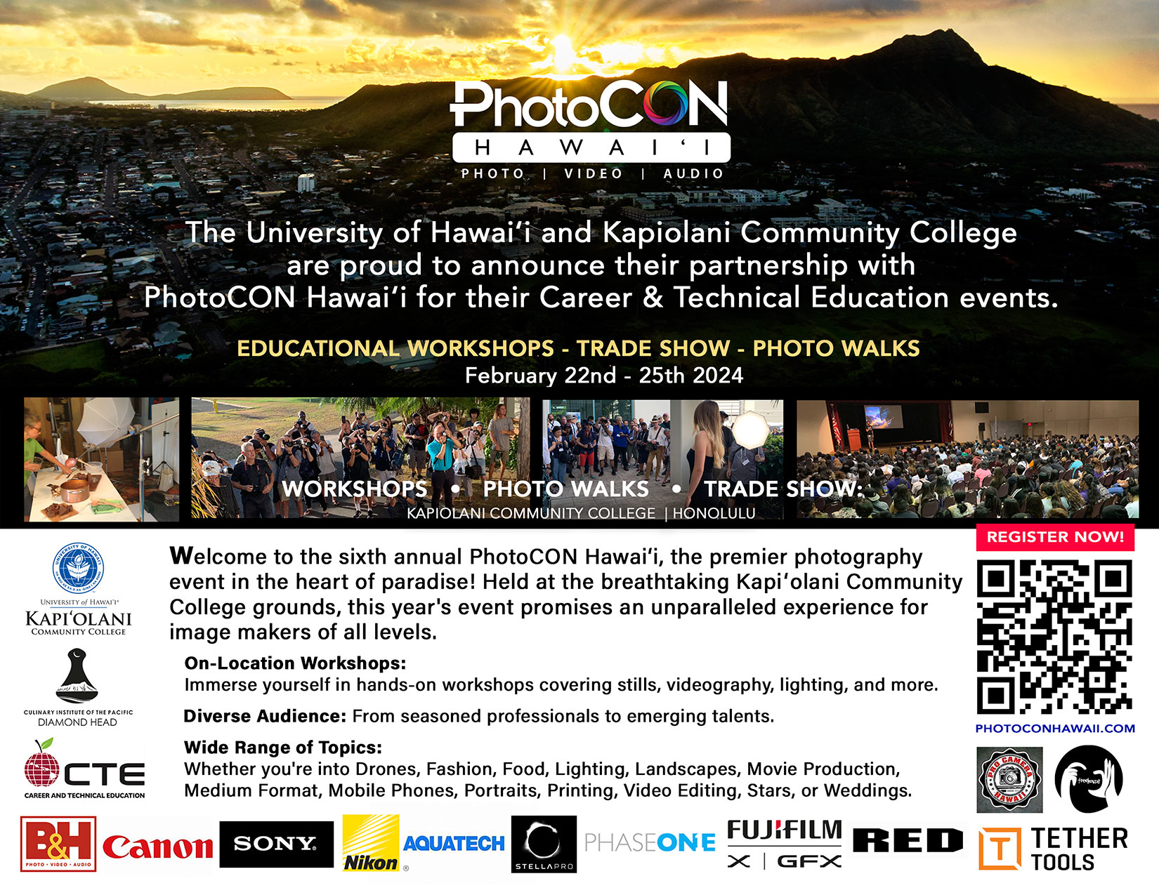 The University of Hawaiʻi and Kapi‘olani Community College are proud to announce its partnership with PhotoCON Hawaiʻi for a celebration of their Career & Technical Education programs and events.PhotoCON Hawai‘i 2024 is Hawaiʻi’s Sixth Annual Première Photo Educational and Informational photography event. On-location workshops cover stills, videography, lighting, and more. From pros to prosumers, professors to students, established artists and developing talent alike will hone their skills and hear invaluable insights from industry icons.