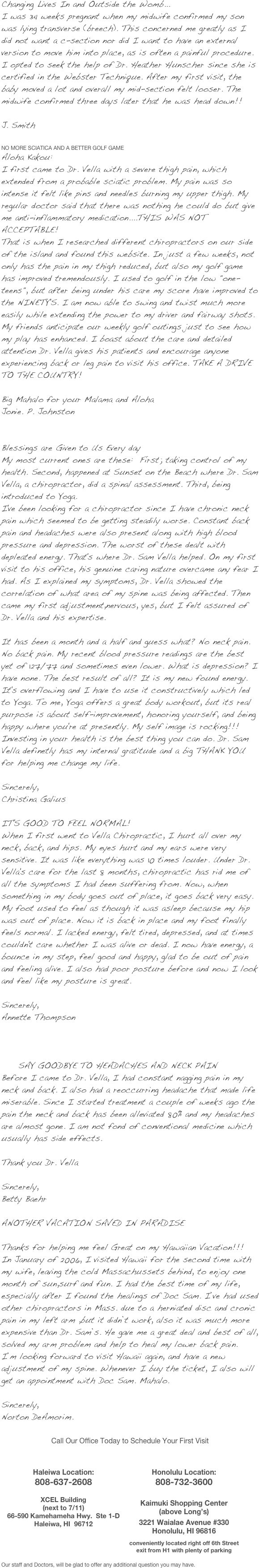 Vella Chiropractic is Oahu's place for natural healing. We utilize a whole body approach focusing on spinal health and alignment, posture, nutrition and maintaining a higher state of wellness with chiropractic. Pain specialists, Workman's Compensation, Personal Injury, Sports Chiropractic, Pregnancy, Webster Technique, Diversified, Activator (light force), Postural Rehab. We also carry only the highest quality vitamin and nutritional supplements.