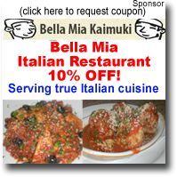 10% OFF COUPON - Bella Mia Kaimuki has a variety of entrees including all your favorite classics such as Spagetti and Meatballs, Lasagna, Manacotti, Chicken Parmaina, and the best pizza in Hawaii!- www.kaimukihawaii.com