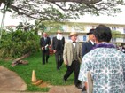Julia McCullen placing a lei on the bust of Queen Lydia Lili`uokalani int he display room
