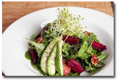 A super-food bonanza. Organic greens, avocado, sprouts, kale, beets, tomatoes, onions, chia seeds, and walnuts, with a balsamic vinaigrette.