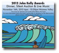 On Saturday, November 16th, the Surfrider Foundation's O‘ahu Chapter will present the 11th Anniversary of their acclaimed John Kelly Environmental Achievement Awards, located at Waimea Valley. Attendees will enjoy dinner, silent auction, and will feature live music from Cynth & The What's His Faces as well as Taimane Gardner. All proceeds will benefit Surfrider's O'ahu Chapter and their efforts to preserve our coastlines. For more information about the John Kelly Awards or donating to the silent auction, please contact Amanda at Amanda@undermyumbrella.com or 808-240-1096.
