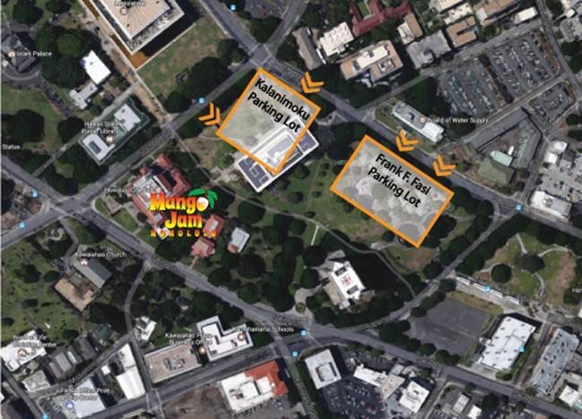 FREE parking for Mango Jam Honolulu will be available in the city's municipal parking lot and nearby Kalanimoku building. Drivers are asked to use the entrances depicted below.