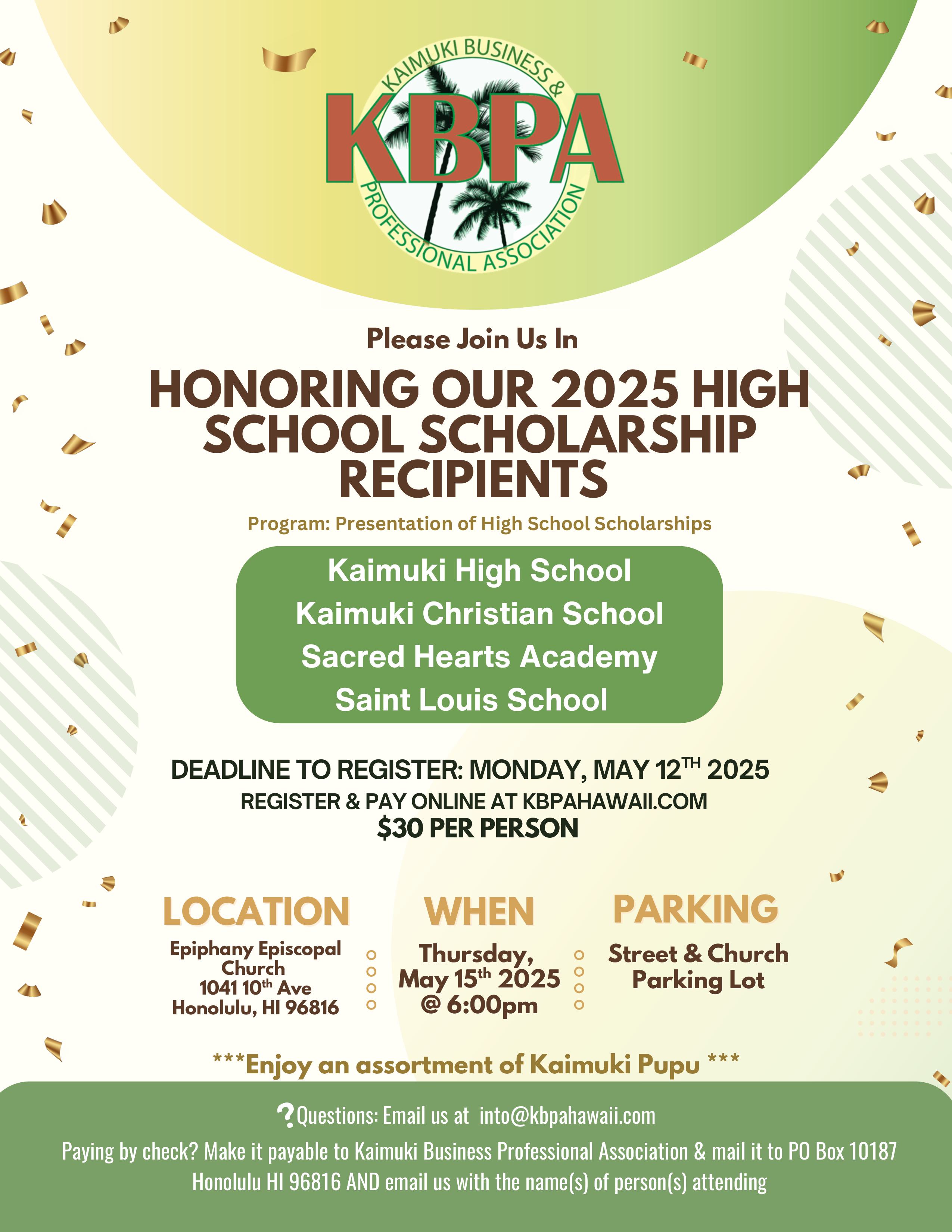 Event Calendar ItemKaimuki Business & Professional Association (KBPA) - Honoring Our 2025 High School Scholarship Recepients