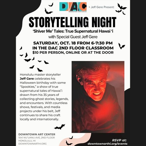 ABOUT JEFF GERE: Jeff Gere is a dynamic storyteller who has electrified audiences in Hawaiʻi and around the world for over 35 years with performances that blend painting, puppetry, mime, and his famously expressive face and voice. Jeff performs constantly. He founded and led Hawaiʻi’s Talk Story Festival for 26 years, created Story TV and Talk Story Radio, and has performed at major festivals from the National Storytelling Festival to tours across Asia, Europe, and beyond. Even after retiring from the Oʻahu Parks Department, Jeff continues to share stories through international tours, virtual productions, retreats, and his annual 30-show Summer Fun series. With countless tales on YouTube and a career devoted to bringing stories to life, Jeff remains one of Hawaiʻi’s most captivating and tireless storytellers. He has six spooky shows this month on two islands, and this DAC show is the only public one. Donʻt miss it!