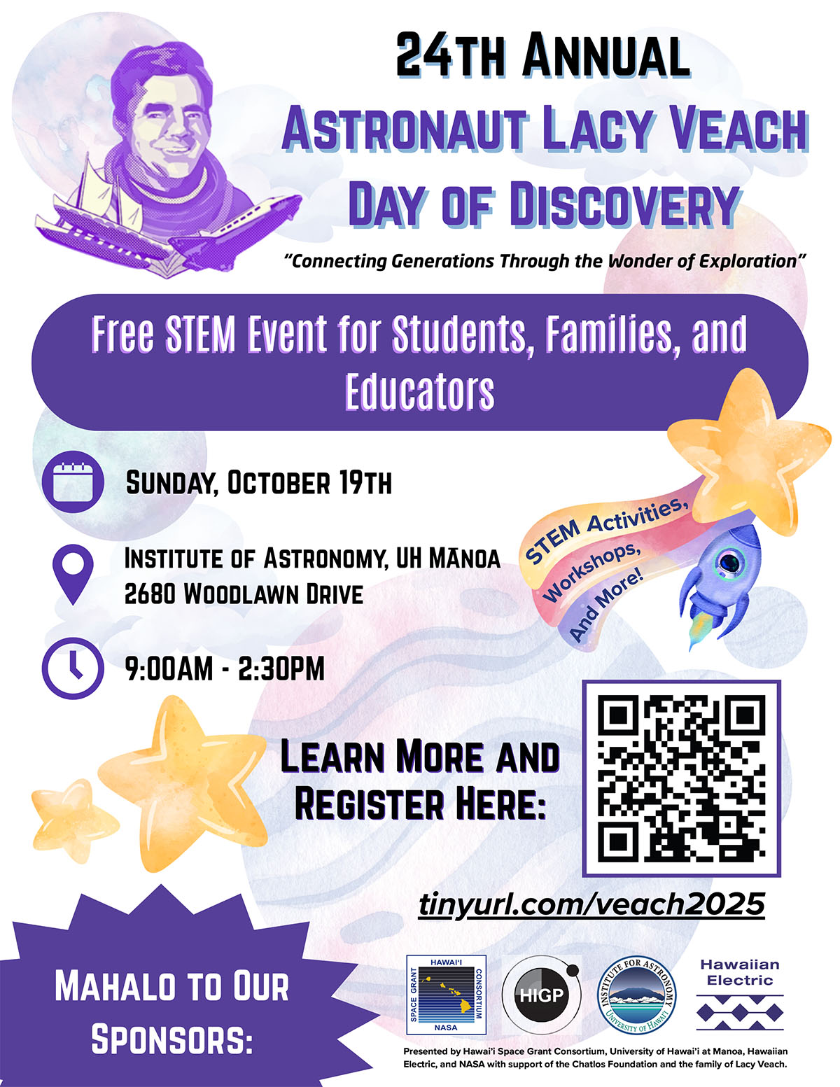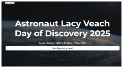 Media are invited to film/photograph the 24th Annual Astronaut Lacy Veach Day of Discovery event on Sunday, Oct. 19, at the U.H. Institute for Astronomy in Mānoa. The free STEM event, which brings together students, families and educators, will feature interactive booths and workshops highlighting space exploration, Earth science, biology, oceanography, rocketry, robotics coding and hands-on educational activities designed for students in grades PK-12. A highlight this year will be special guest appearance by the Pacific Outpost 501st Legion, the nonprofit Hawaiʻi chapter of the Lucasfilm’s preferred Star Wars Imperial costuming group.