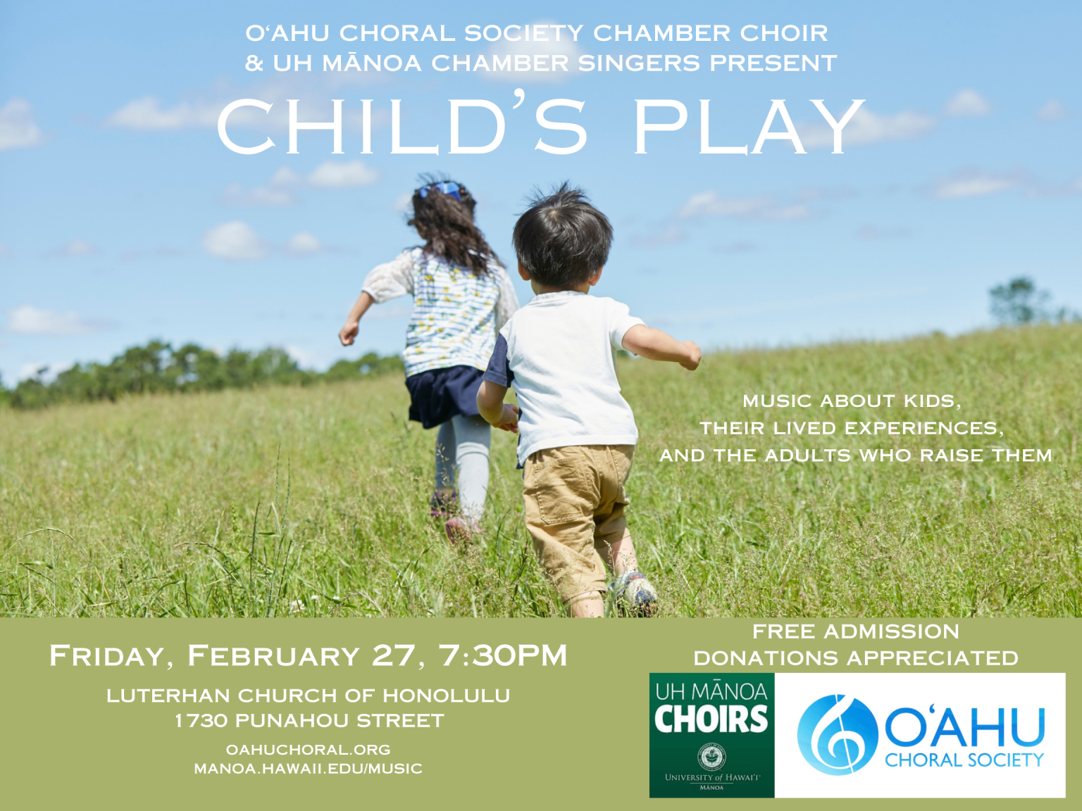 FEBRUARY 27, 7:30 PM Child’s Play The Lutheran Church of Honolulu 1730 Punahou St, Honolulu, HI 96822 2/27/2026 The UH Mānoa Chamber Singers and O‘ahu Choral Society Chamber Choir present Child's Play: choral music about kids, their lived experiences, and the adults who raise them. Featuring works by Trumbore, Kauka, Jēkabsone, Puccini, Wong, Tormis, and more - join us! When: 7:30 PM Where: The Lutheran Church of Honolulu Admission: Free Free