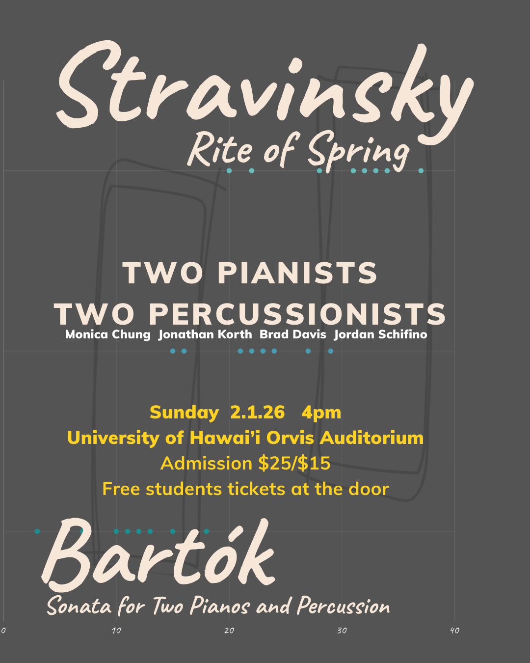 FEBRUARY 1, 4:00 PM The Rite of Spring Orvis Auditorium at UH Mānoa 2411 Dole Street, Honolulu, HI, United States February 1, 2026 4:00 pm The Rite of Spring Be prepared to feel the hall rumble… this program features 2 pianists on 2 pianos and an alarming number of percussion instruments. Program: Igor Stravinsky, The Rite of Spring Bela Bartok, Sonata for 2 Pianos & Percussion Jordan Schifino, percussion Brad Davis, percussion Jonathan Korth, piano Monica Chung, piano ... Free – $25 FRI 20