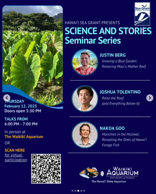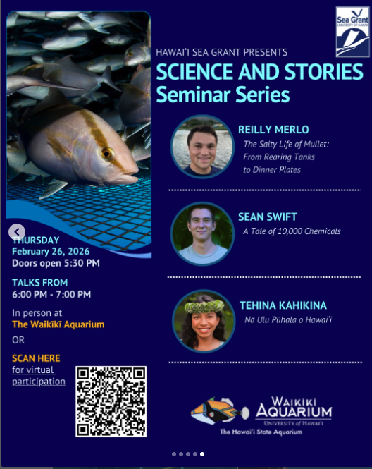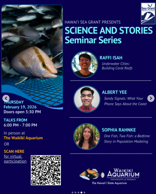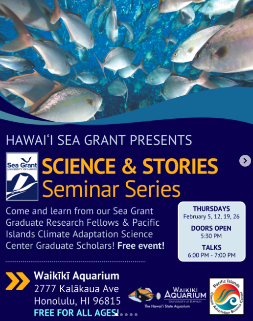 Join us at the Waikīkī Aquarium or over Zoom every Thursday evening in February for an engaging, all-ages seminar series where science meets storytelling. Hawaiʻi Sea Grant Research Fellows and Pacific Islands Climate Adaptation Science Center Graduate Scholars will share their research as stories—exploring what motivates them, why their work matters, and using creative analogies to bring methods and data analysis to life.