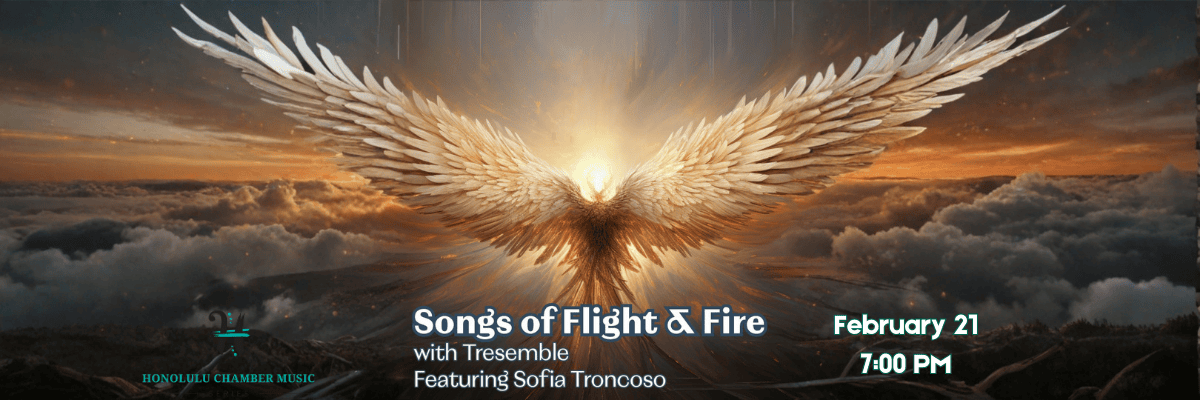 Chamber Music Hawai’i – Songs of Flight and Fire FEBRUARY 21, 7:00 PM Orvis Auditorium at UH Mānoa 2411 Dole Street, Honolulu, HI, United States February 21 Chamber Music Hawaii presents Songs of Flight and Fire 7:00 PM With Tresemble Featuring Sofia Troncoso Vocal brilliance takes flight in this dynamic program of light, spirit, and longing. From Handel’s divine sparkle to Golijov’s haunting laments, soprano Sofia Troncoso brings each phrase to life. Program: BACH - Aria from Cantata 51, BWV 51 HANDEL - Eternal Source ... $5 – $40 TUE 24