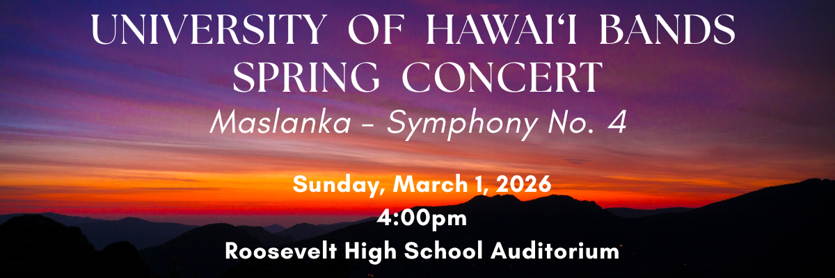 University of Hawaiʻi Bands Spring Concert MARCH 1, 4:00 PM Roosevelt High School Auditorium 1120 Nehoa Street, Honolulu, HI, United States March 1, 2026 UH Bands Spring Concert 4:00 pm Univearsity of Hawai‘i Symphonic Band Thomas Kloss, conductor Frank Ticheli – Sun Dance Jack End – Blues for a Killed Cat Minoo Dixon – Frequency Philip Sparke – Suite from Hymn of the Highlands University of Hawai‘i Wind Ensemble Jeffrey Boeckman, conductor Pablo Furukawa, graduate conductor Heinrich Schütz – Psalm 8 ... FRI 6