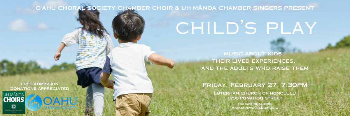 Child’s Play FEBRUARY 27, 7:30 PM The Lutheran Church of Honolulu 1730 Punahou St, Honolulu, HI 96822 February 27, 2026 Child’s Play 7:30 pm The UH Mānoa Chamber Singers and O‘ahu Choral Society Chamber Choir present Child’s Play: choral music about kids, their lived experiences, and the adults who raise them. Featuring works by Trumbore, Kauka, Jēkabsone, Puccini, Wong, Tormis, and more – join us! The Lutheran Church of Honolulu Admission: Free Free March 2026 SUN 1