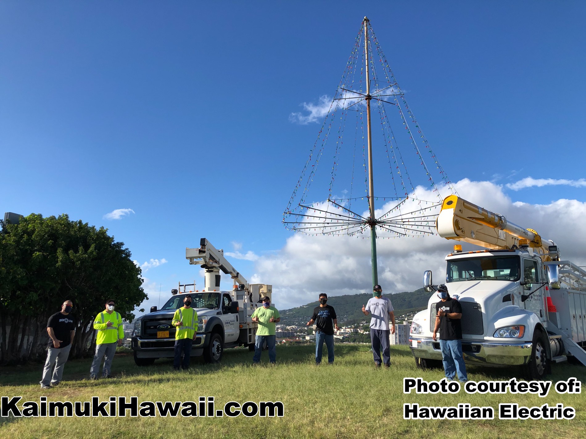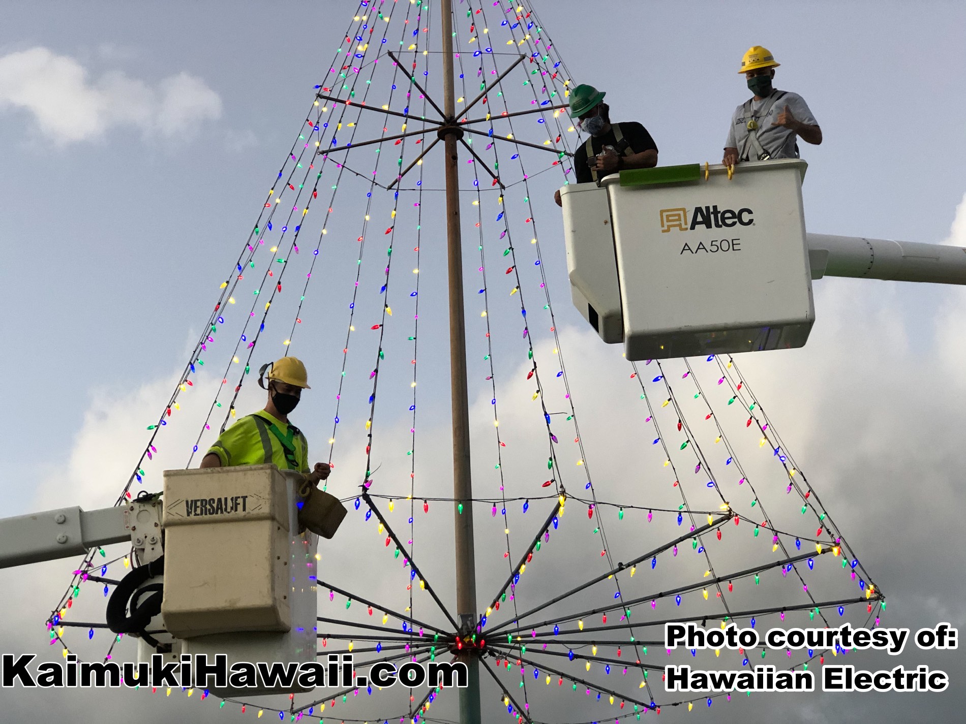 The illuminated tree, which sits about 40 feet above the mini park off Koko Head Avenue, had gone dark the past few years. But about a dozen Hawaiian Electric linemen, trouble men, inspectors, and substation technicians worked Wednesday to string new multicolored, energy- efficient LED light strands atop its galvanized steel base.
