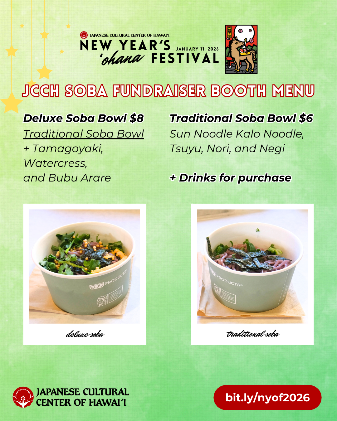 JCCH SOBA FUNDRAISER BOOTH: The JCCH Board of Directors will be serving delicious soba bowls featuring Sun Noodle’s Kalo Noodles, a product developed in collaboration with Chef Gooch using locally grown taro and fresh poi. Enjoy this tasty dish while supporting the JCCH!