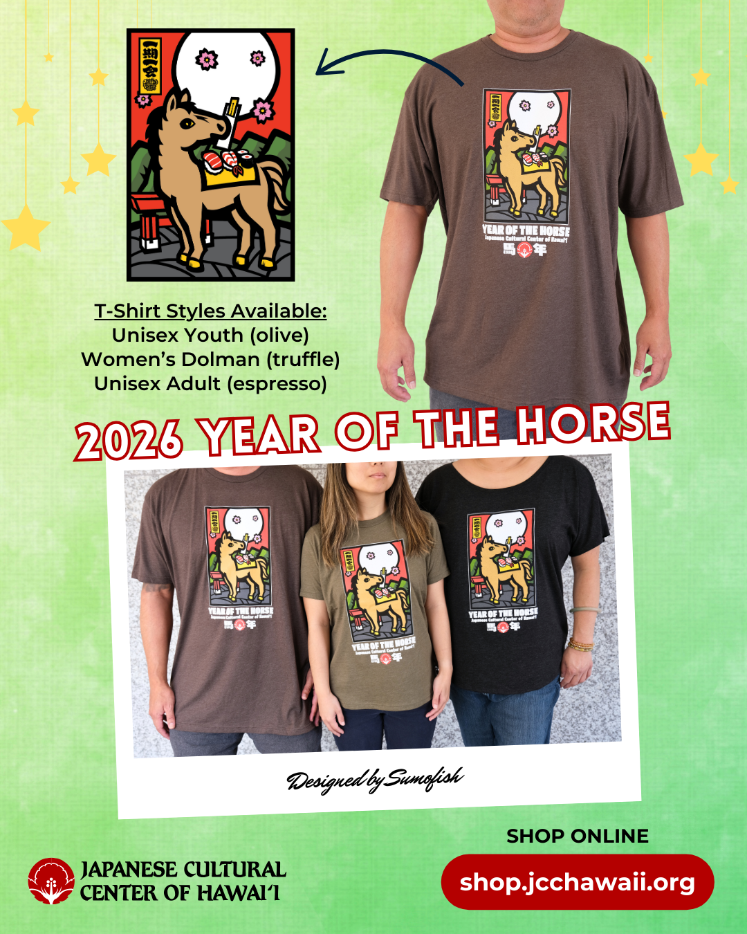 2026 YEAR OF THE HORSE T-SHIRTS: Inspired by hanafuda (flower cards), elements from Japanese and local culture surround our horse, a symbol of freedom, strength, and success. Visit the JCCH Gift Shop to purchase our new t-shirt designed by Sumofish. Multiple sizes and styles are available. Quantities are limited.