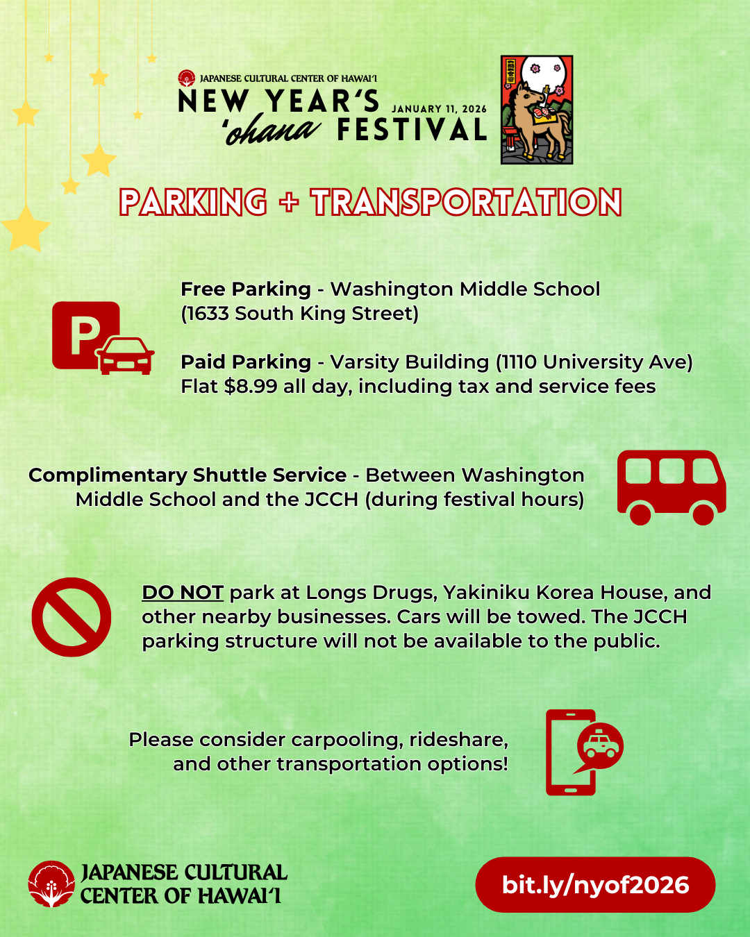 PARKING + TRANSPORTATION: Free parking will be available at Washington Middle School. A complimentary shuttle will run between shuttle stops at the JCCH (near the red Torii gate along South Beretania Street) and Washington Middle School (entrance along South King Street). Paid parking will be available at Varsity Building (Flat $8.99 all day, including tax and service fees). Please consider carpooling, rideshare, and other transportation options!