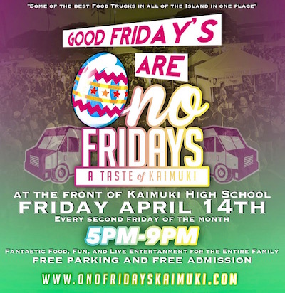 Ono Fridays at Kaimuki High School (KHS) - APRIL 2017 (4/14/2017 - 5pm - 9pm) - A fundraiser for Kaimuki High School Football. Great food and entertainment. More...