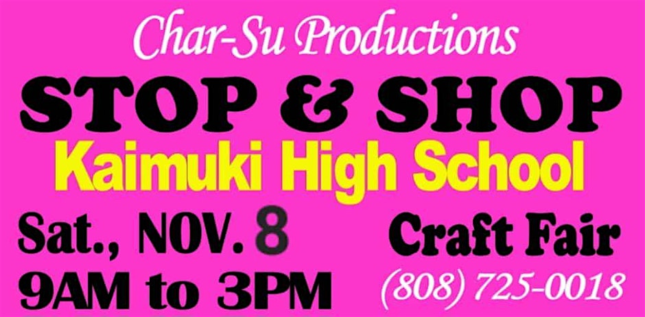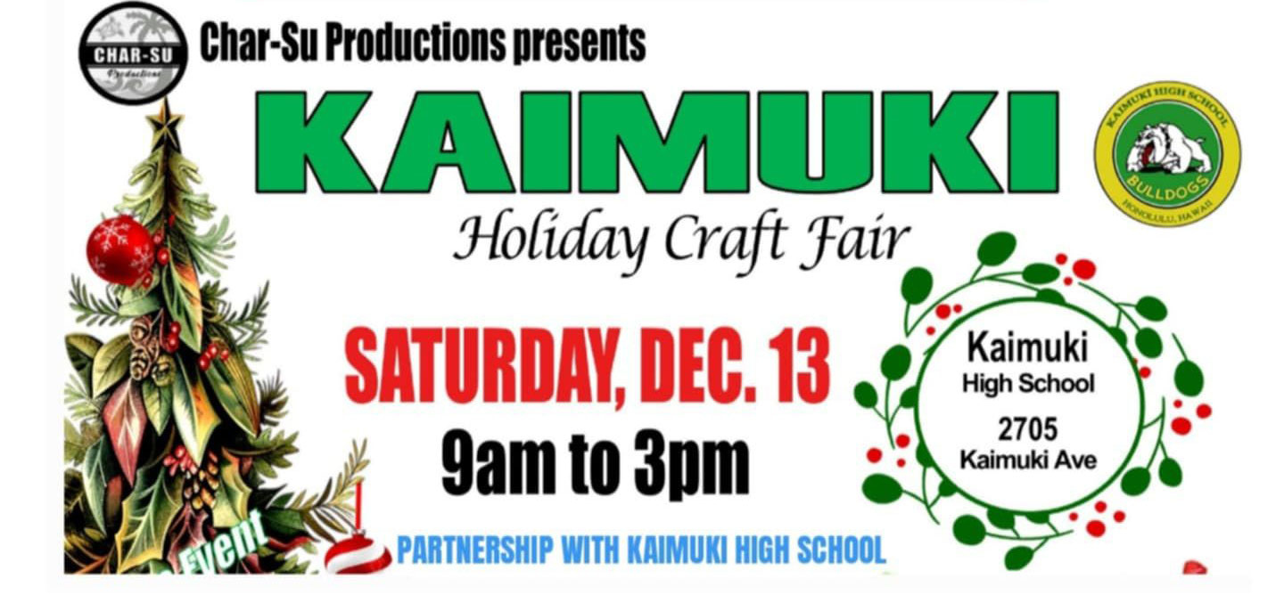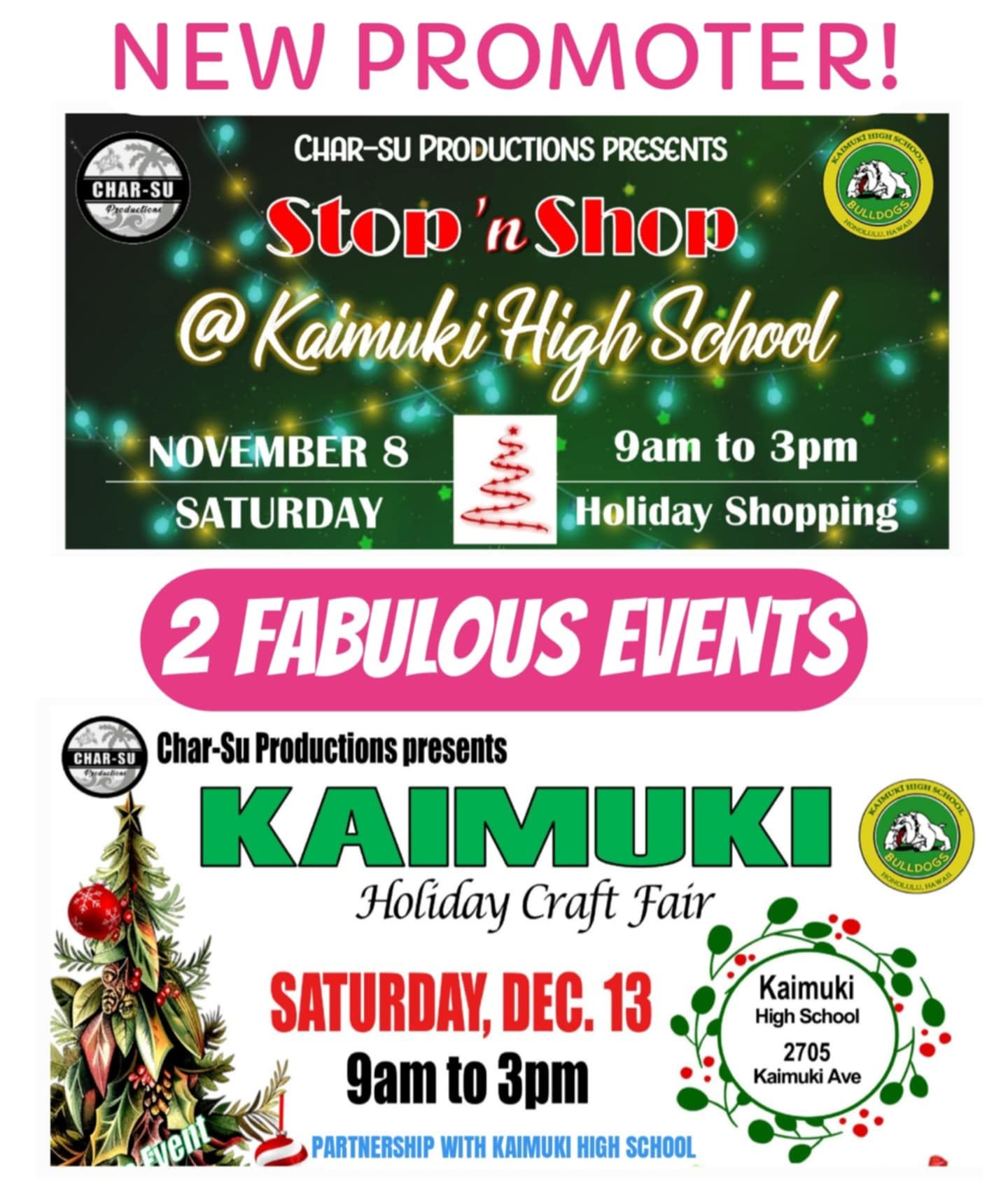 Char-Su Productions will be hosting two craft fairs at Kaimuki High School on: Saturday, November 8, 2025 Saturday, December 13, 2025 This year, we’re proud to announce a partnership with Kaimuki High School. The events will be exciting and a true celebration of school pride and community connection. Here’s what you can look forward to: KHS clubs and student groups showcasing their products. Shop local, discover unique handmade goods, and support local businesses. Live performances throughout the day Participation from area schools A refreshed and enhanced fair experience for all Let’s continue to support this cherished tradition and make it a fantastic event for both the school and the community! Mark your calendars and spread the word — Kaimuki is the place to be this holiday season!
