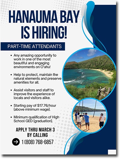 Now’s your chance to work in one of O‘ahu’s most beautiful and engaging environments, by applying with the City and County of Honolulu’s Department of Parks and Recreation. More...