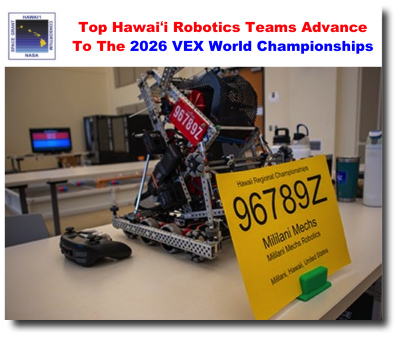 A total of 52 robotic teams representing public and private schools as well as club organizations and home teams from Oʻahu, Hawaiʻi Island, Maui, and Molokaʻi competed at this weekend’s Hawaiʻi VEX V5 Robotics Competition Regional Championship with the top 7 teams now advancing to compete with the best robotic teams from around the globe at the 2026 VEX Robotics World Championships in St. Louis, Missouri, April 21 – 30, at the America’s Center Convention Complex. More...