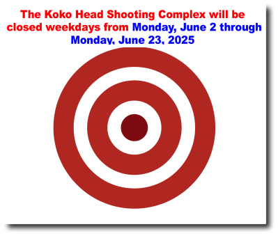 The Koko Head Shooting Complex will be closed weekdays from Monday, June 2 through Monday, June 23, 2025 to allow for site surveying ahead of safety improvements to the outdoor range. More...