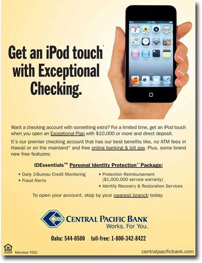 Central Pacific Bank (CPB) Offers iPod Touch with Exception Checking Plan