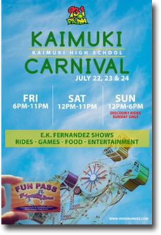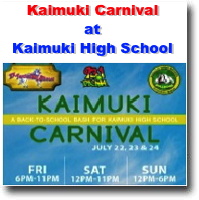 Kaimuki Carnival at Kaimuki High School - July 22 - 24, 2016 Announced A Back-to-School Bash at Kaimuki High School. |