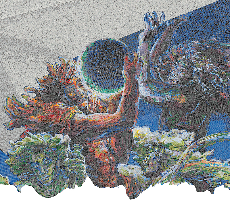 Artist rendering of the glass mosaic, showing the details of Lono, Kū, Hina, Kāne and Kanaloa.These akua (deities) are metaphoric of nature and reinforce the harmonious familial relationship that exists between humanity and the natural environment.
