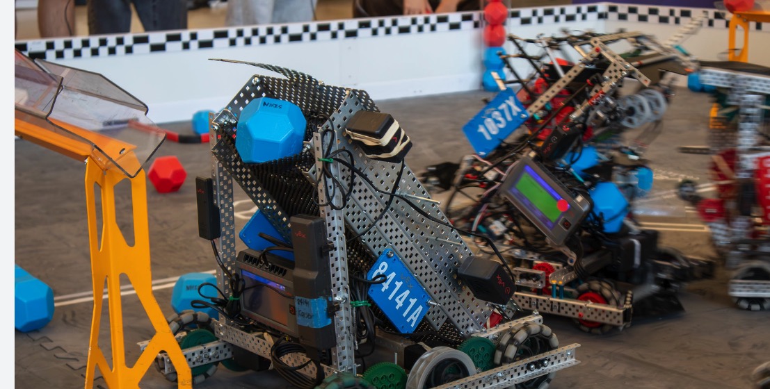 The VEX V5 Robotics Competition featured both high school and middle school teams. This year’s challenge, Push Back, is a fast-paced game that pits alliances of two teams against another alliance and requires robots to score blocks in goals, control zones within goals, and park in defined zones at the end of the match. Robots have a fifteen second period of autonomous play followed by a one minute and forty-five second (1:45) driver-controlled play.