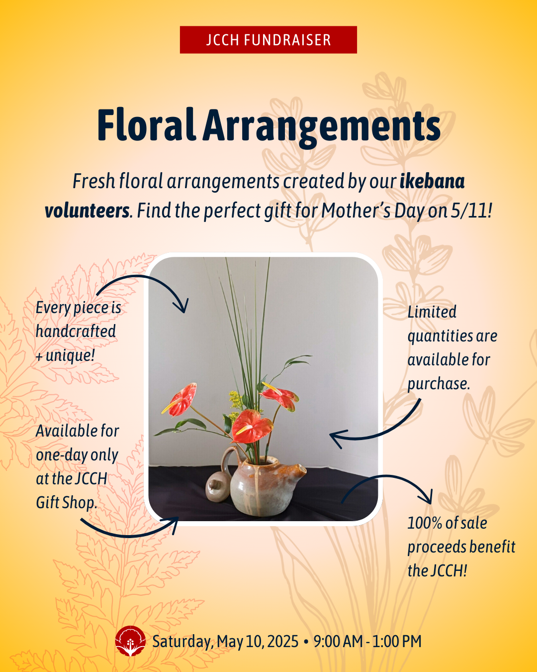 FLORAL ARRANGEMENTS FUNDRAISER: Just in time for Mother’s Day, fresh floral arrangements created by our ikebana volunteers will be available for purchase at the JCCH Gift Shop. 100% of sale proceeds benefit the JCCH.