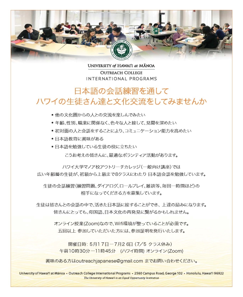 The University of Hawaiʻi at Mānoa Outreach College International Programs is seeking volunteers. Please email outreachjapanese@gmail.com if you are interested in volunteering.