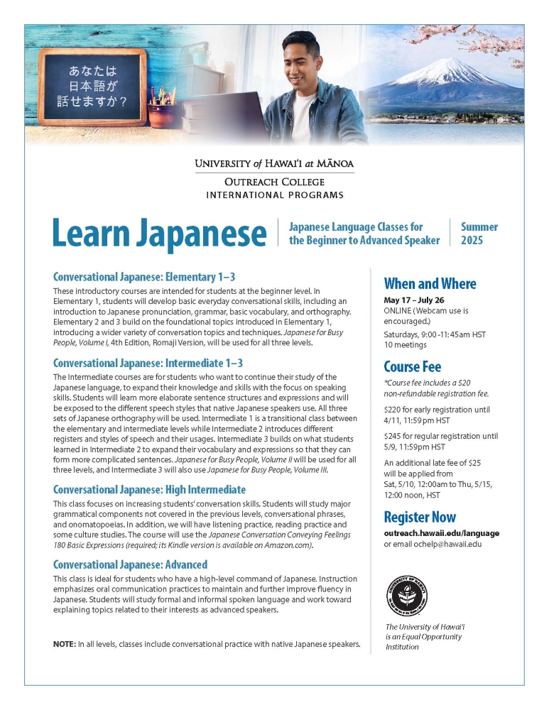 The University of Hawaiʻi at Mānoa Outreach College is offering Japanese language classes during the Summer 2025 semester. Courses range from Elementary to Advanced conversational levels.