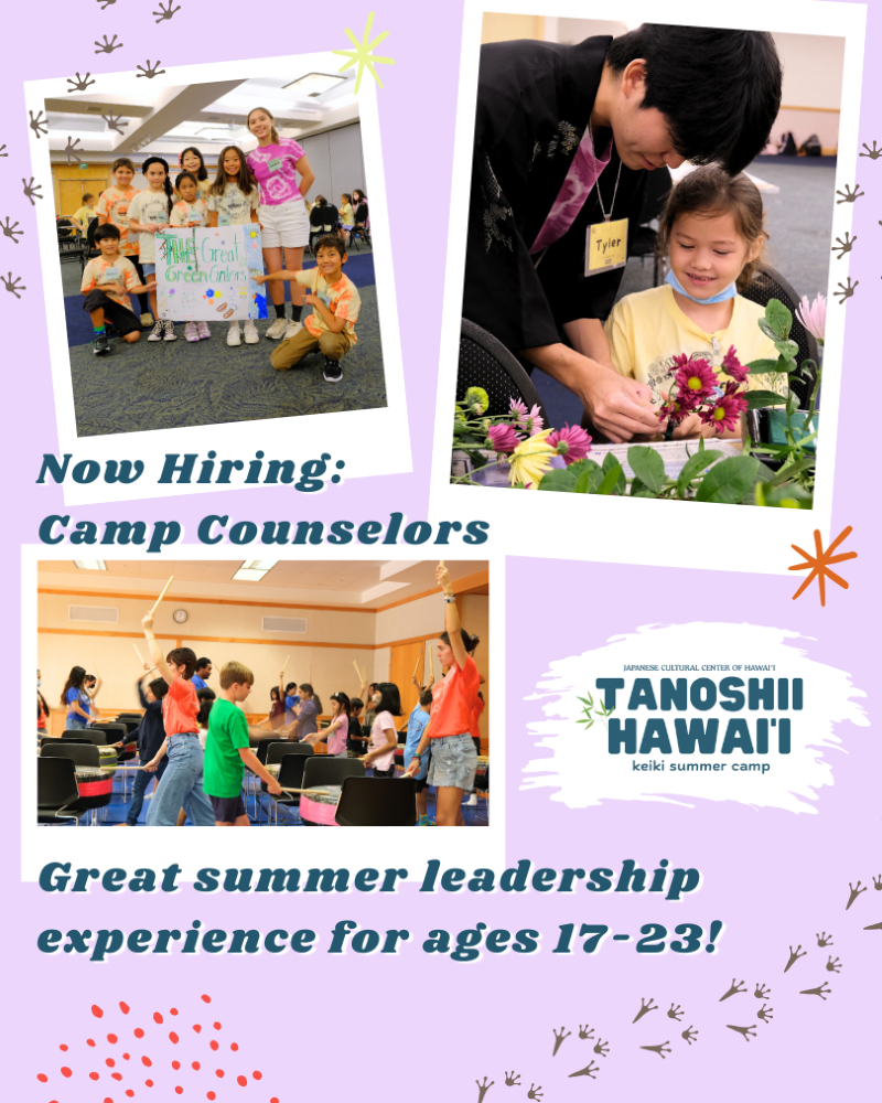 The JCCH is actively recruiting enthusiastic and energetic individuals (17-23 years old) to join our Tanoshii Hawaiʻi summer camp team! Camp counselors help create a safe and welcoming environment for children to explore and appreciate diversity through engaging activities. Applications are now being accepted through Friday, June 6, 2025.