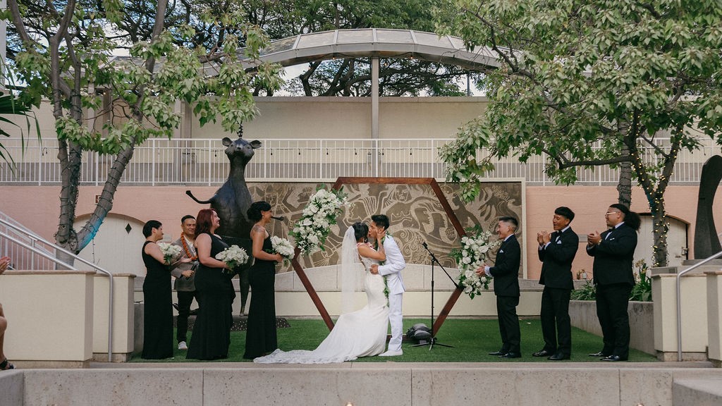 Photo: Mylinh and Kaimi wedding ceremony in the Sculpture Garden. Photo credit: Sara Rodriguez Photography.