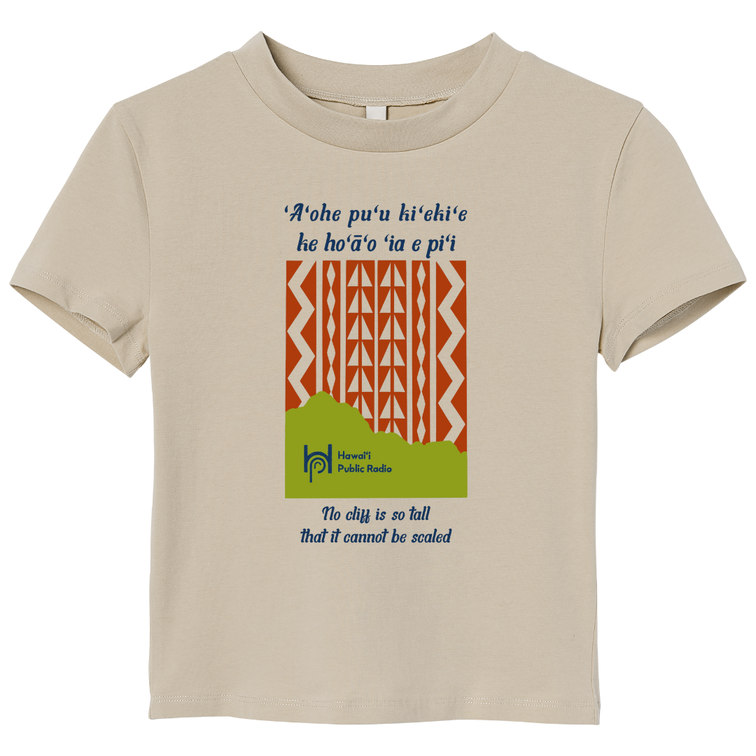 Printed on the shirt: ‘A‘ohe pu‘u ki‘eki‘e ke ho‘ā‘o ‘ia e pi‘i.