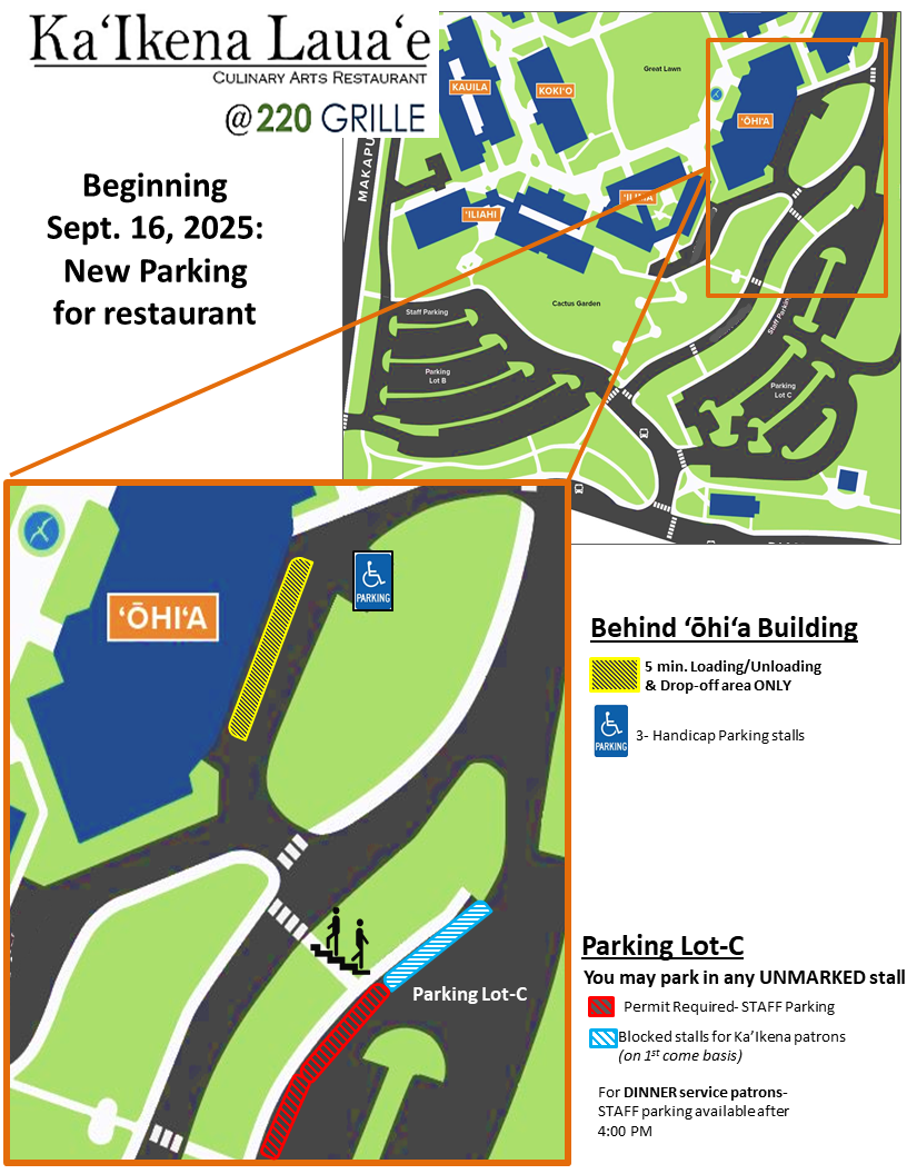 • Parking Update: Parking is now available only in Parking Lot C in any unmarked stalls (see map below). Please note that parking is no longer available behind the ʻŌhiʻa Building.