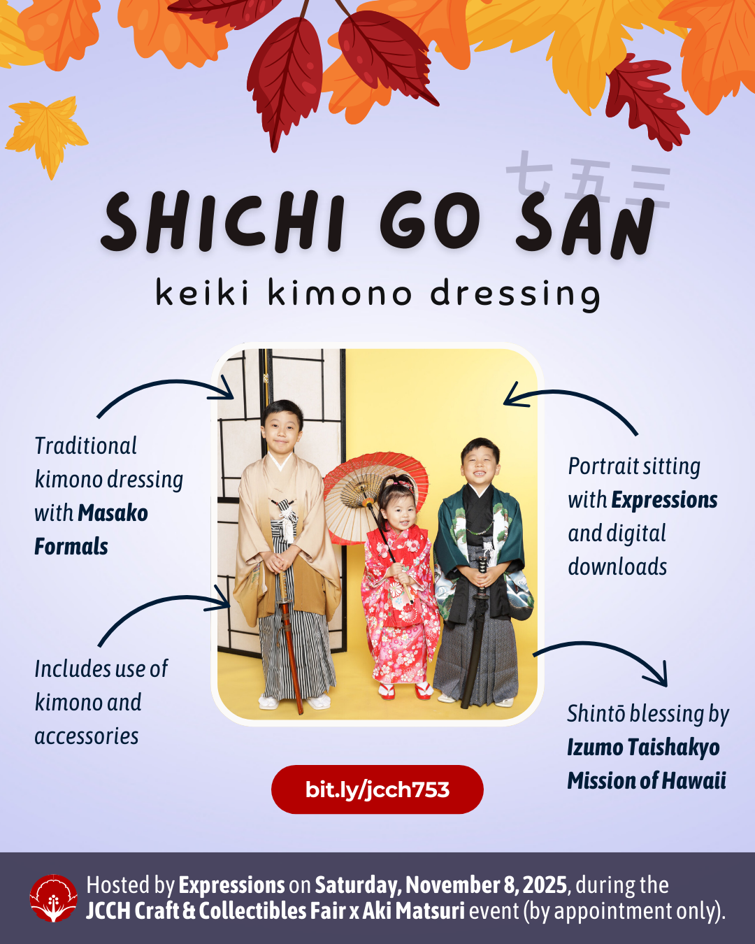 This year’s keiki kimono dressing event will be hosted by Expressions during the JCCH Craft & Collectibles Fair x Aki Matsuri event in November. Participation is by appointment only. Please contact Expressions directly at info@expressionshawaii.net or (808) 951-7827 for all Shichi Go San inquiries.