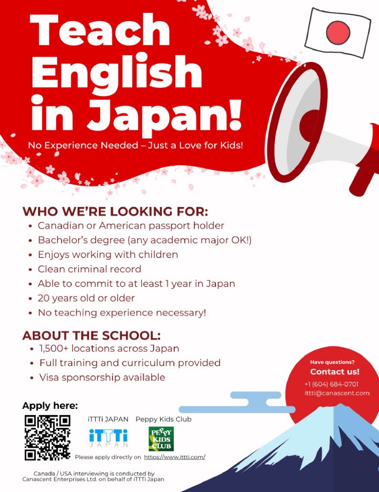 Interested in living and working in Japan? Peppy Kids Club, an English language school for children (1 year old to high school students), is now hiring. No teaching experience is necessary. Apply directly on iTTTi.