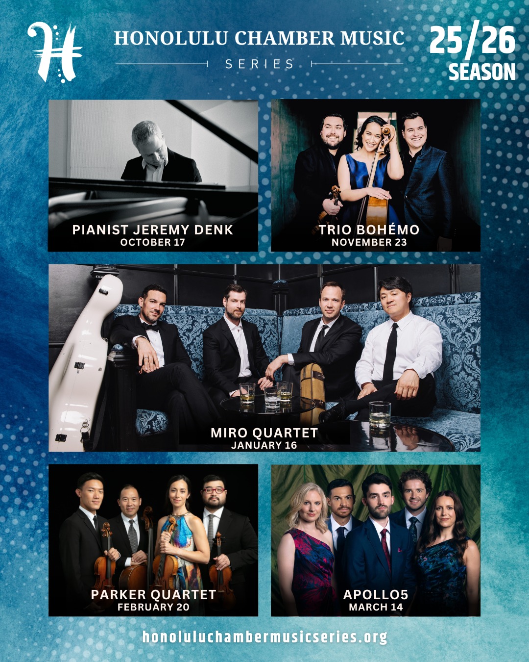 Honolulu Chamber Music Series is bringing five incredible concerts to Honolulu for their 25-26 season! See the links below for ticketing options for the season, as well as for individual concerts.