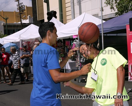 Ballplayer gets an assist from a KBPA volunteer during exhibition at Celebrate Kaimuki Kanikapila
