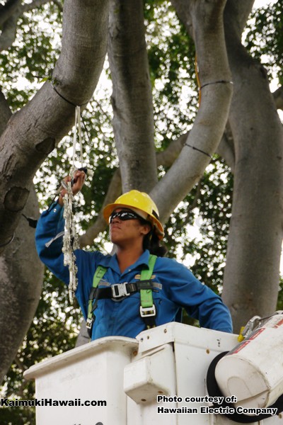 Tihana Kekauoha, an apprentice line(wo)man, puts up a snowflake Christmas light at the Kaimuki playground.