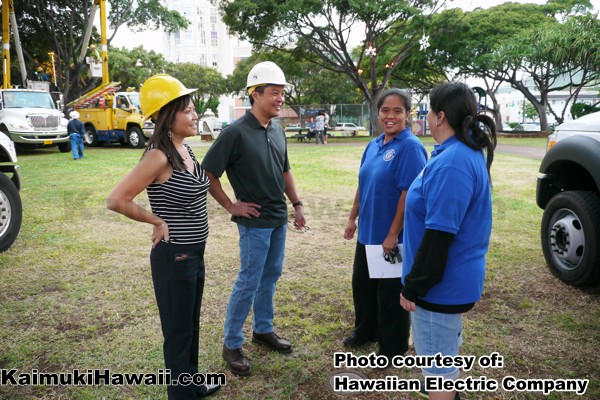 Darcy Endo-Omoto, Hawaiian Electric vice president - government & community affairs, and Scott Seu, with Kaimuki playground staff.